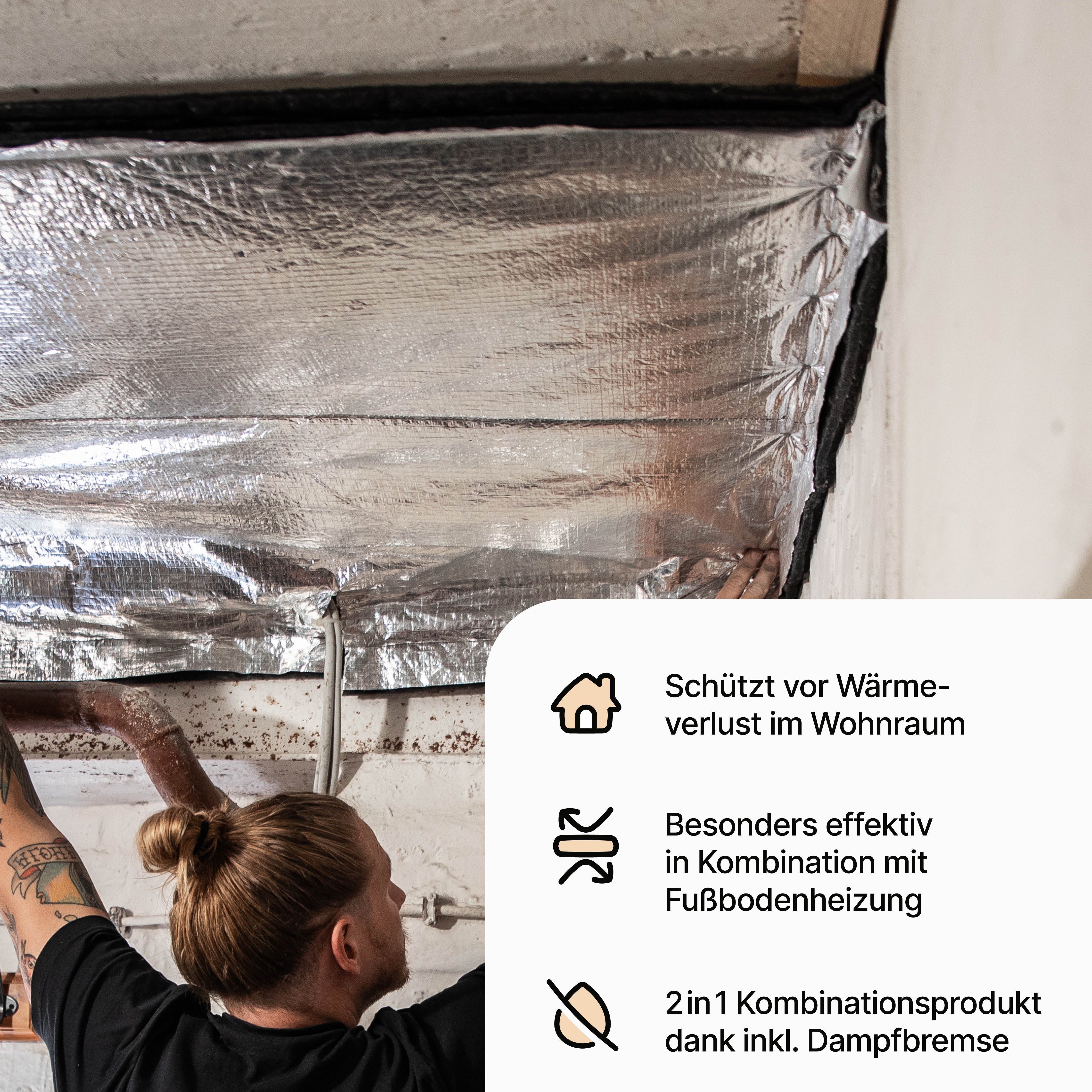 Mit FRIEDWIL FX5 kannst du deine Kellerdecke dämmen und somit Kälte von Wärme isolieren – kinderleicht und effektiv. Dank der integrierten Dampfbremse sowie der innovativen Reflexionstechnologie bleibt die Wärme genau dort, wo sie hingehört: oben!